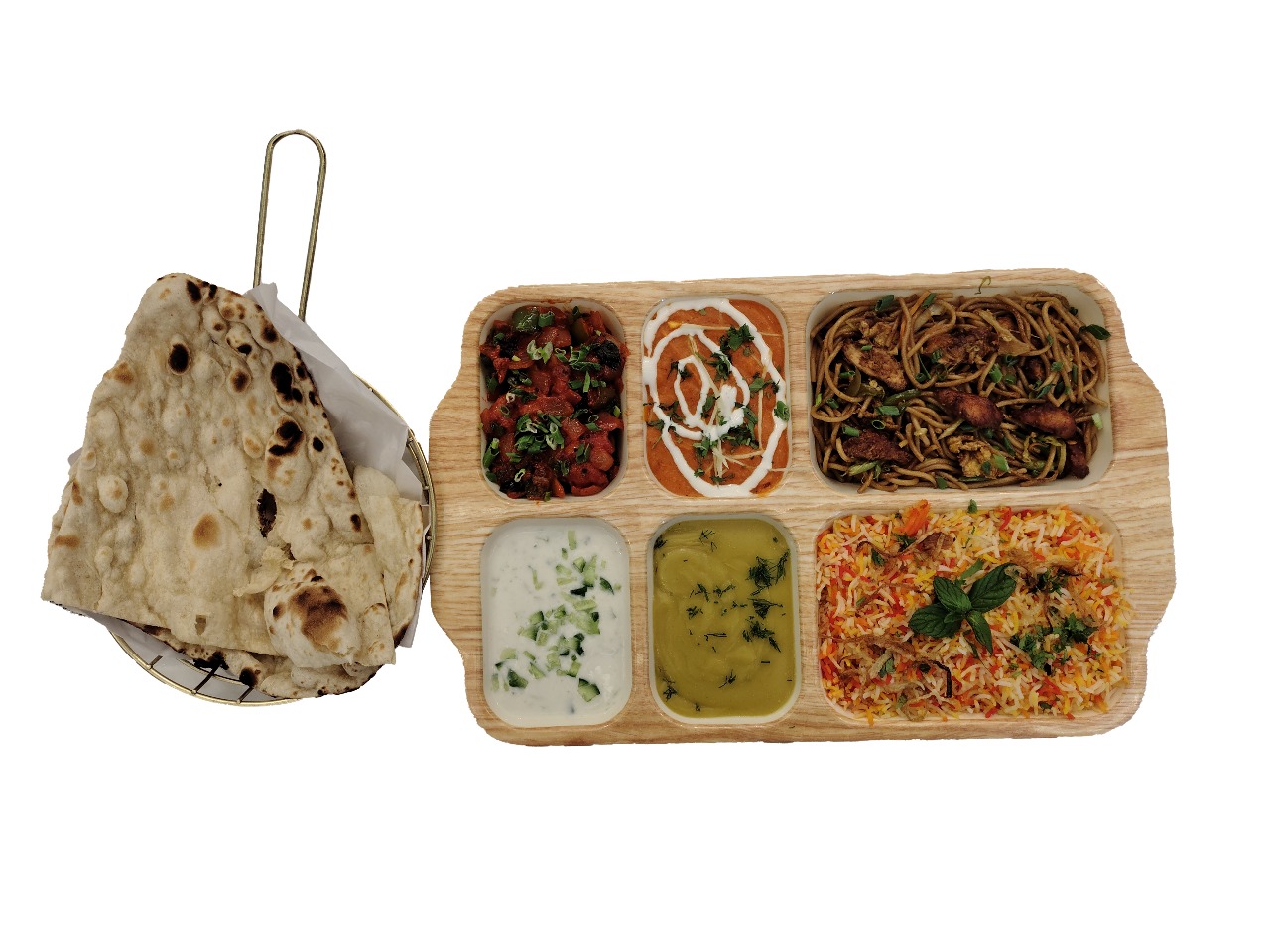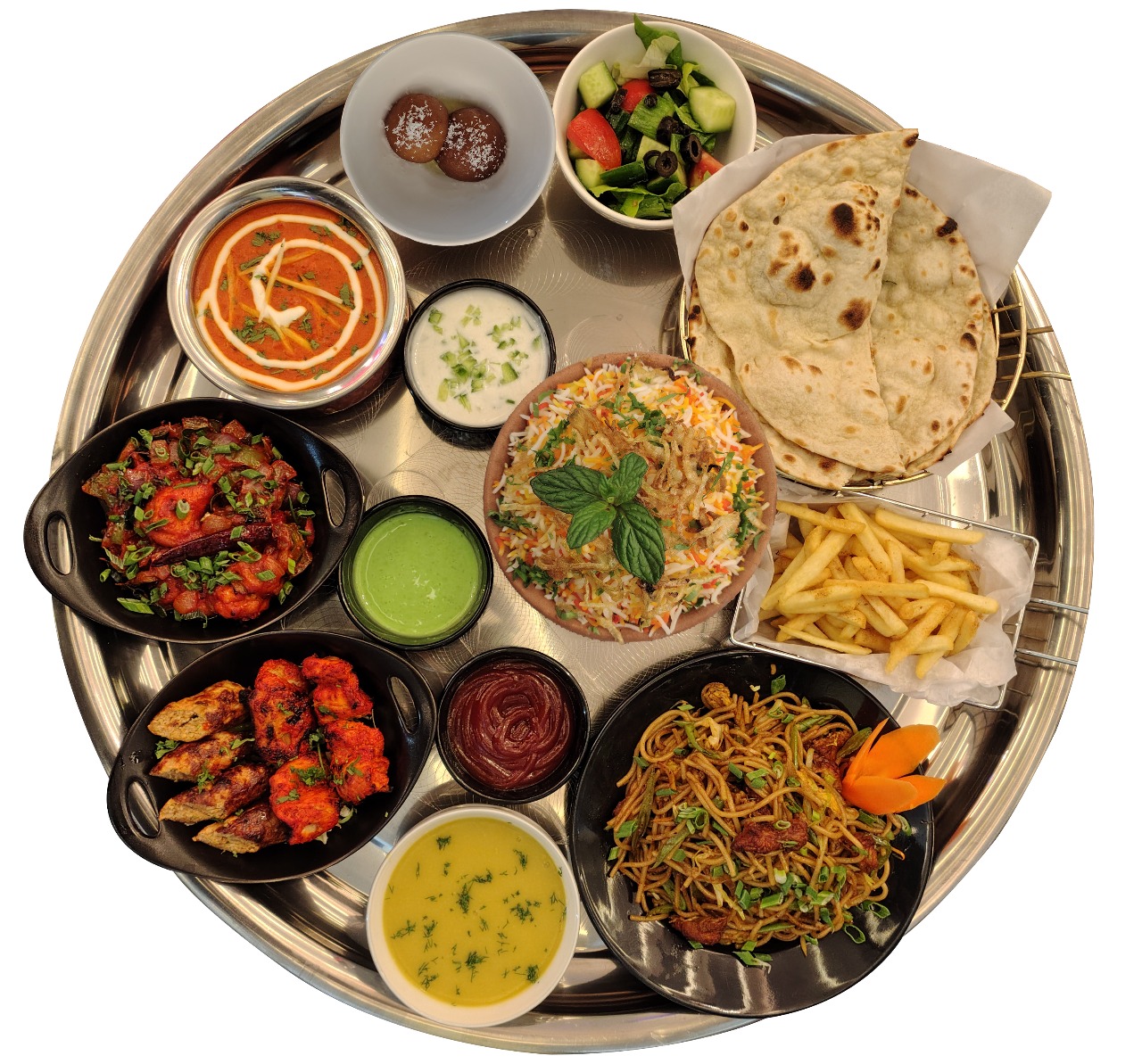وجبة كاملة تتضمن أرز برياني عطري، وبطاطا مقلية مقرمشة، ودجاج بالزبدة، وسلطة خضراء طازجة، وزبادي بالخيار، ومشروب غازي. A complete m