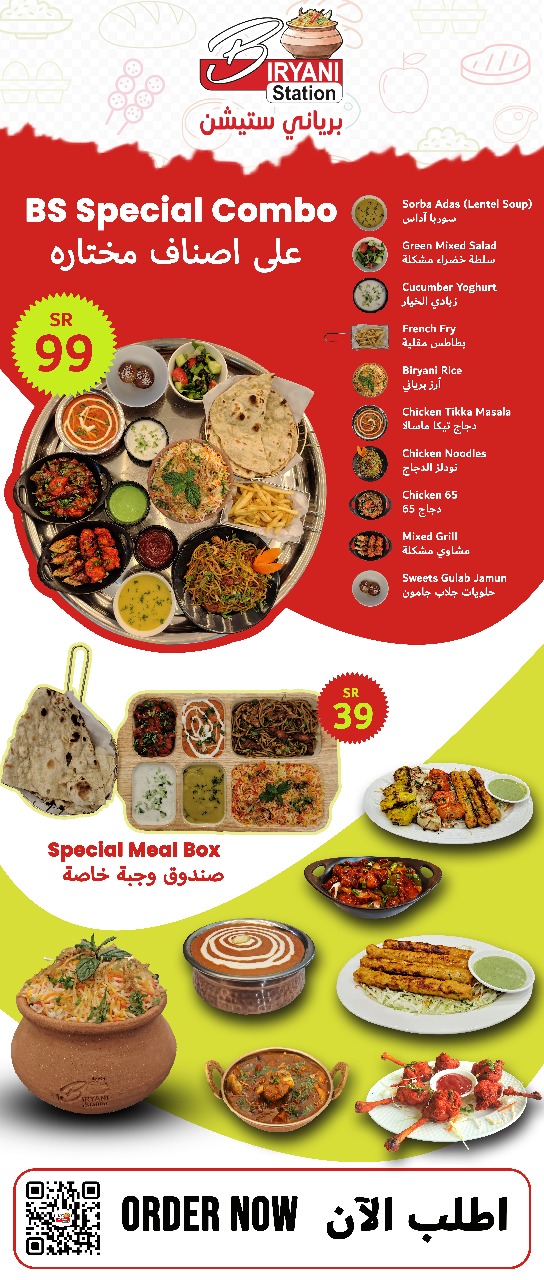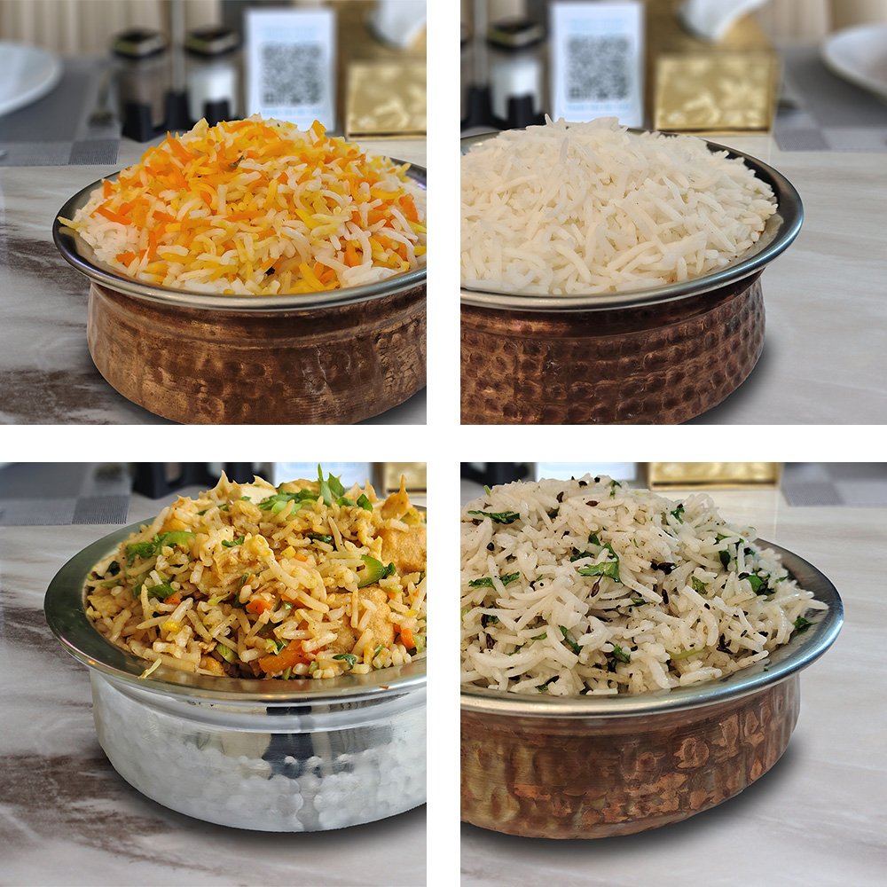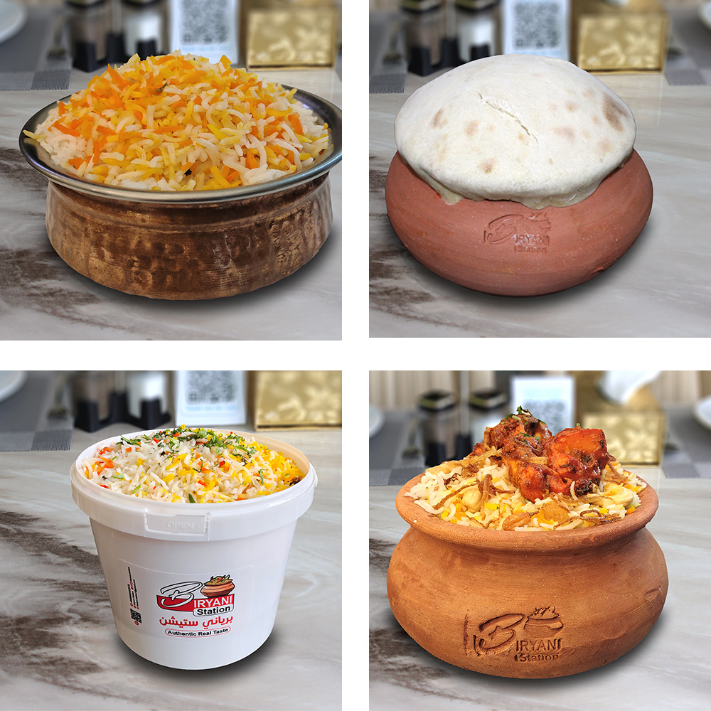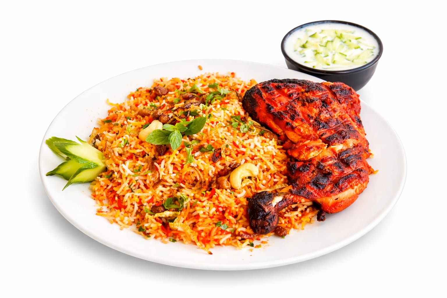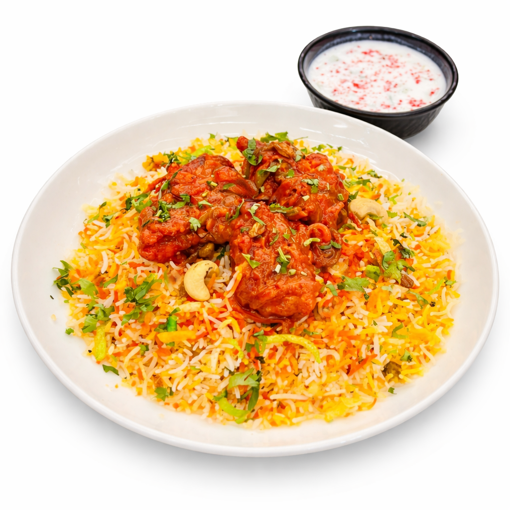 أرز بسمتي طويل الحبة مطهو ببطء على البخار مع دجاج طري متبل، وتوابل عطرية، ونكهة زعفران غنية، ويقدم مع سلطة خيار بالزبادي المنعشة ل