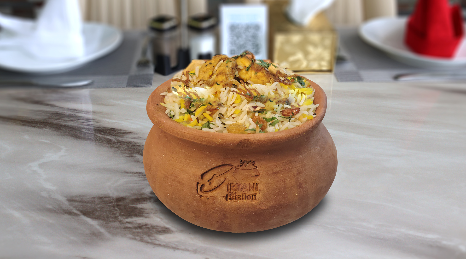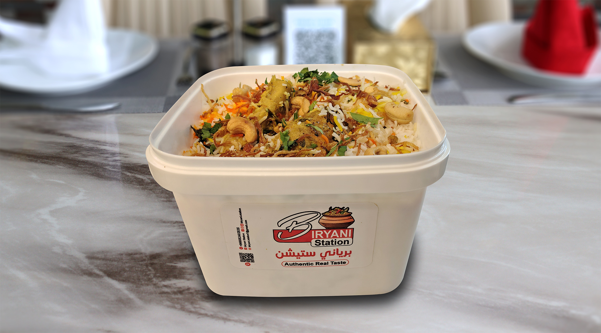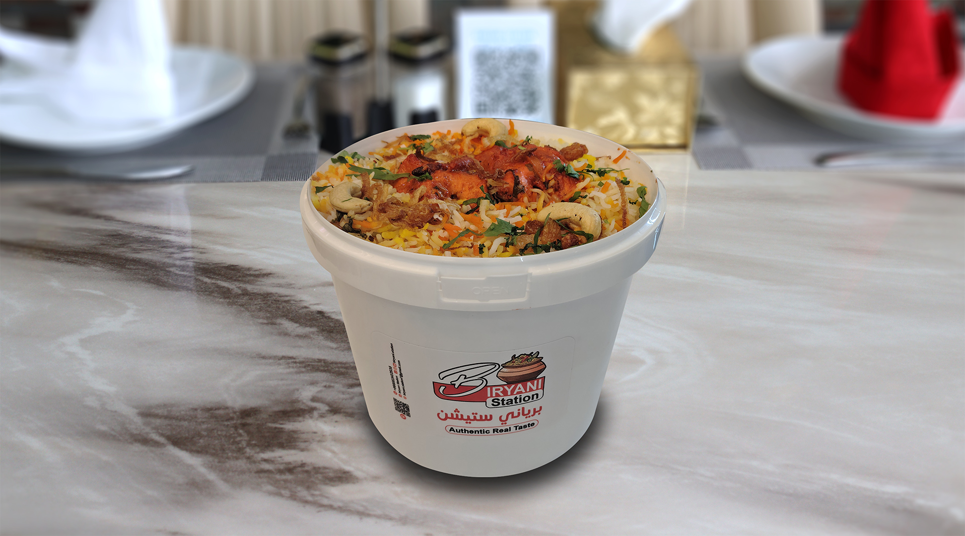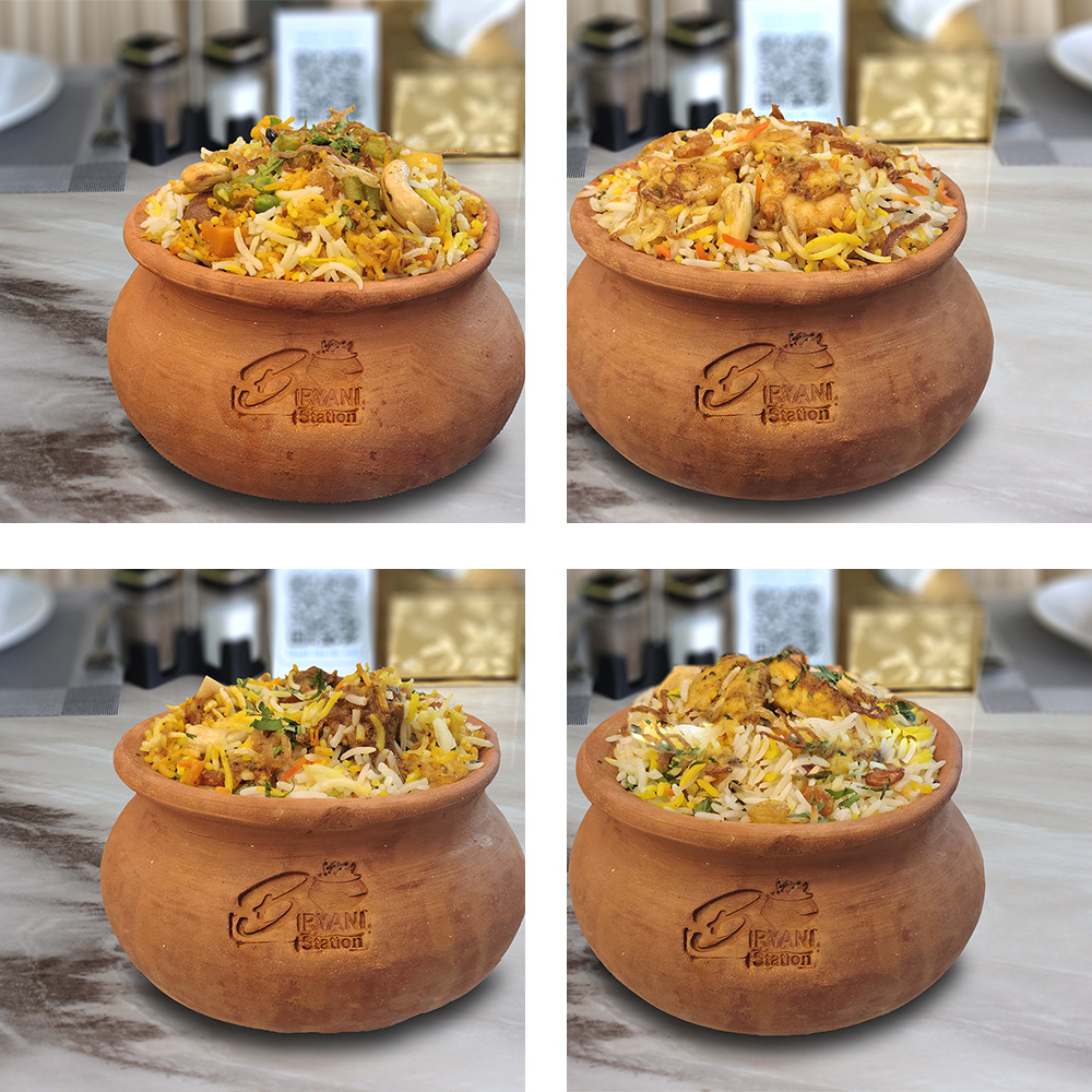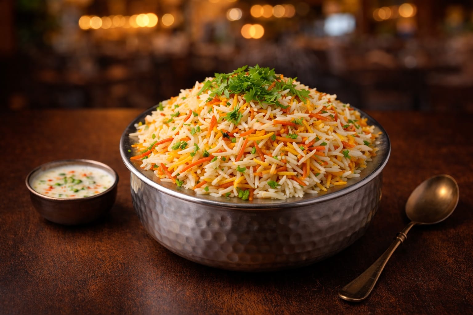أرز بسمتي طويل الحبة مطهو ببطء على البخار مع دجاج طري متبل، وتوابل عطرية، ونكهة زعفران غنية، ويقدم مع سلطة خيار بالزبادي المنعشة ل