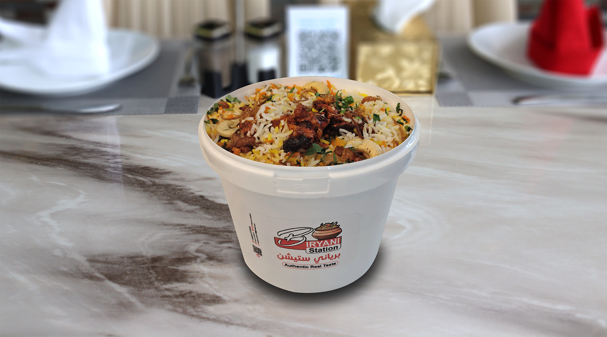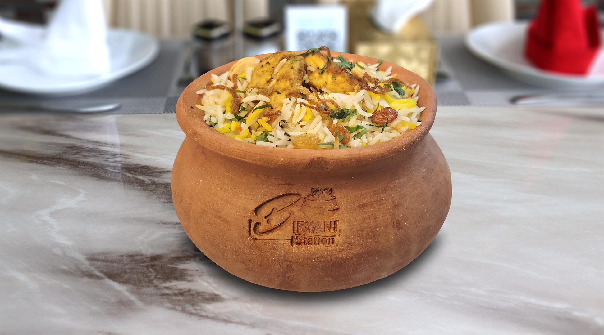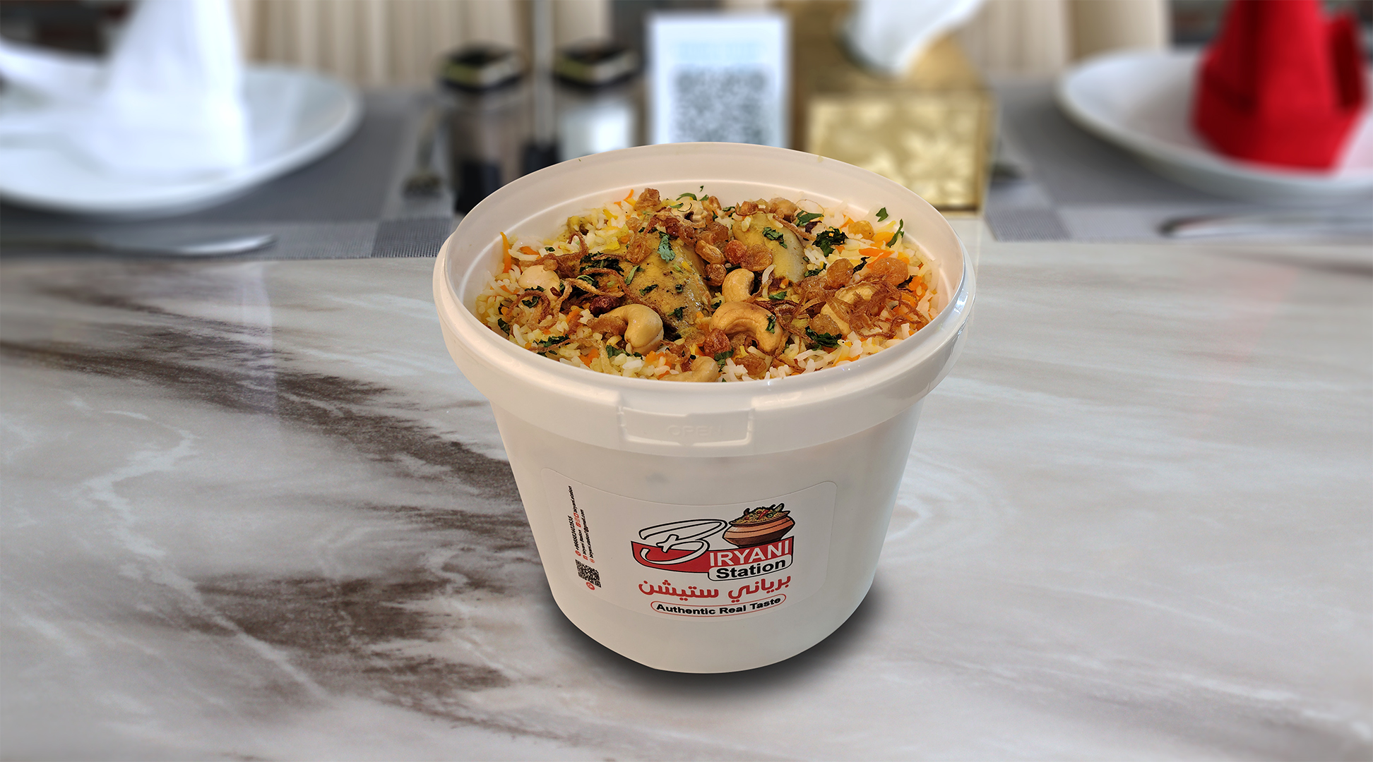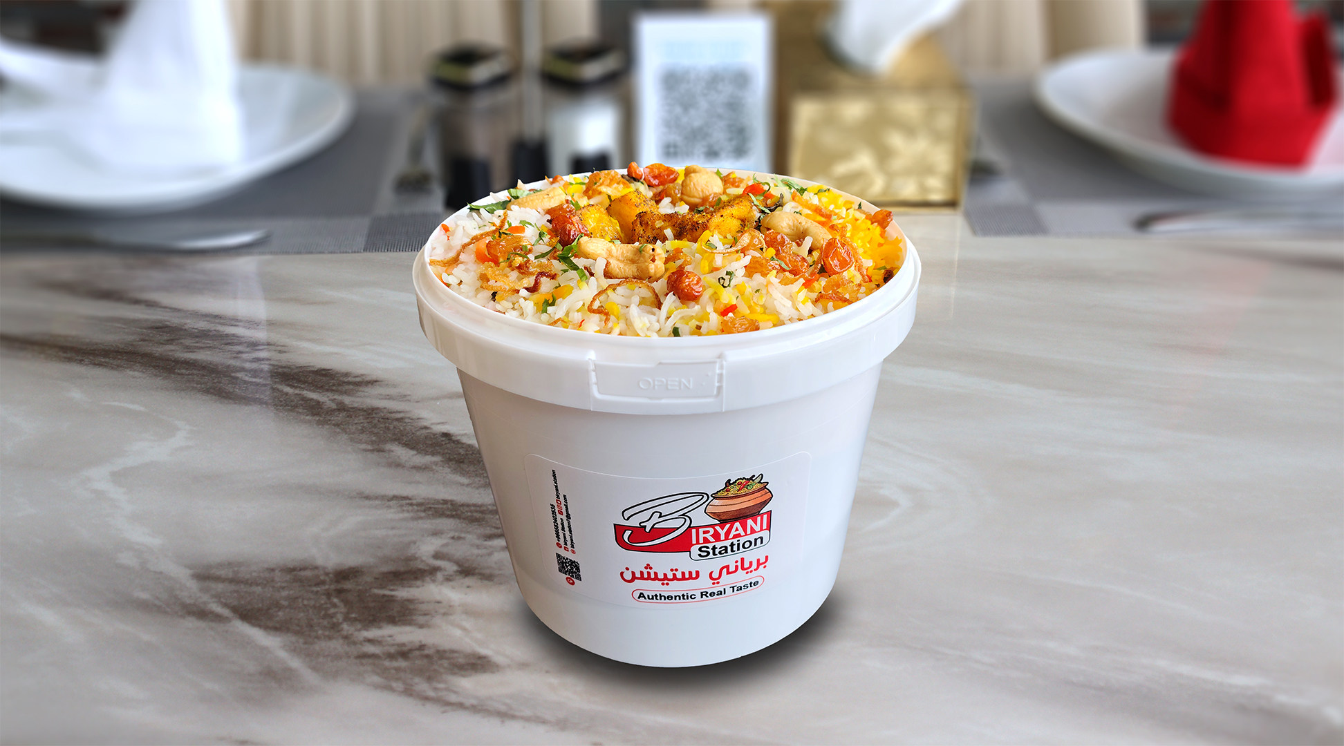 أرز بسمتي طويل الحبة مطهو ببطء على البخار مع دجاج طري متبل، وتوابل عطرية، ونكهة زعفران غنية، ويقدم مع سلطة خيار بالزبادي المنعشة ل