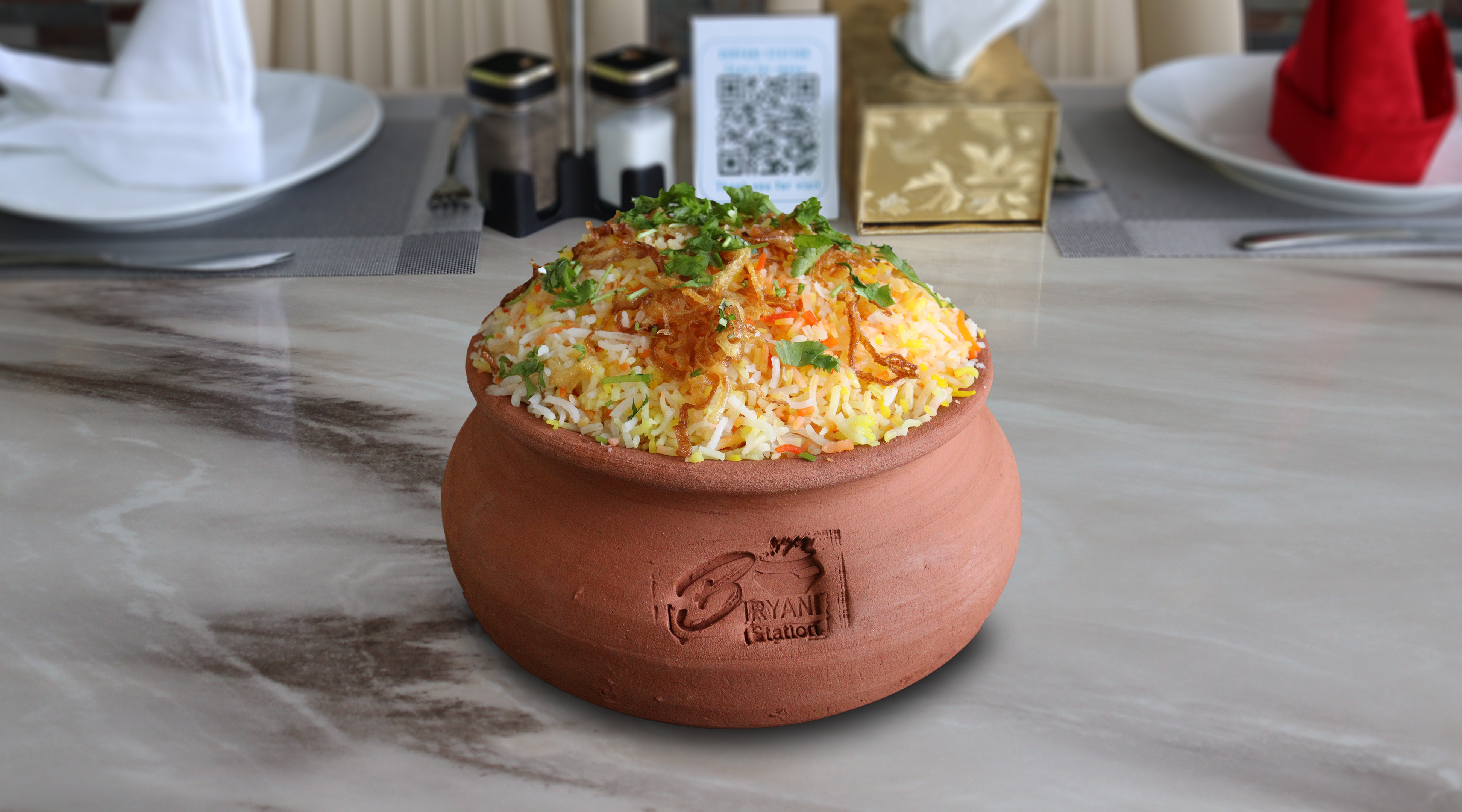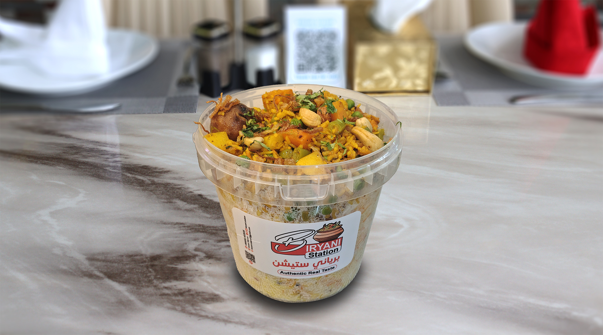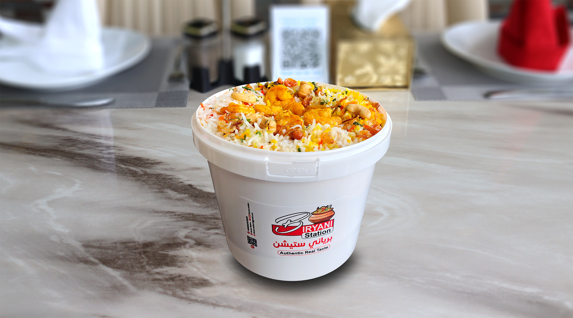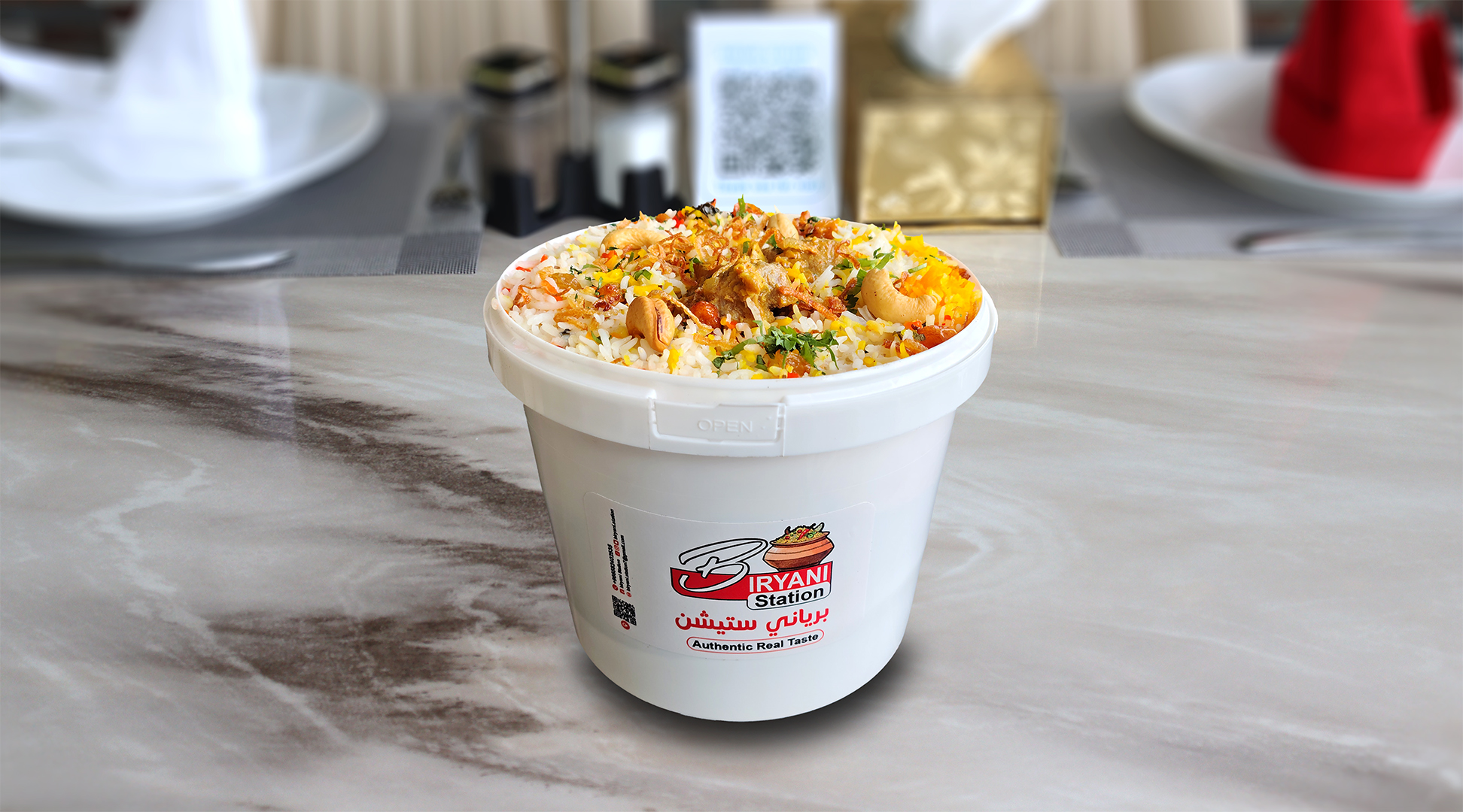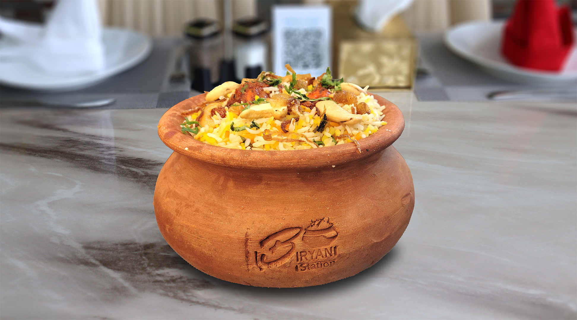 أرز بسمتي طويل الحبة مطهو ببطء على البخار مع دجاج طري متبل، وتوابل عطرية، ونكهة زعفران غنية، ويقدم مع سلطة خيار بالزبادي المنعشة ل