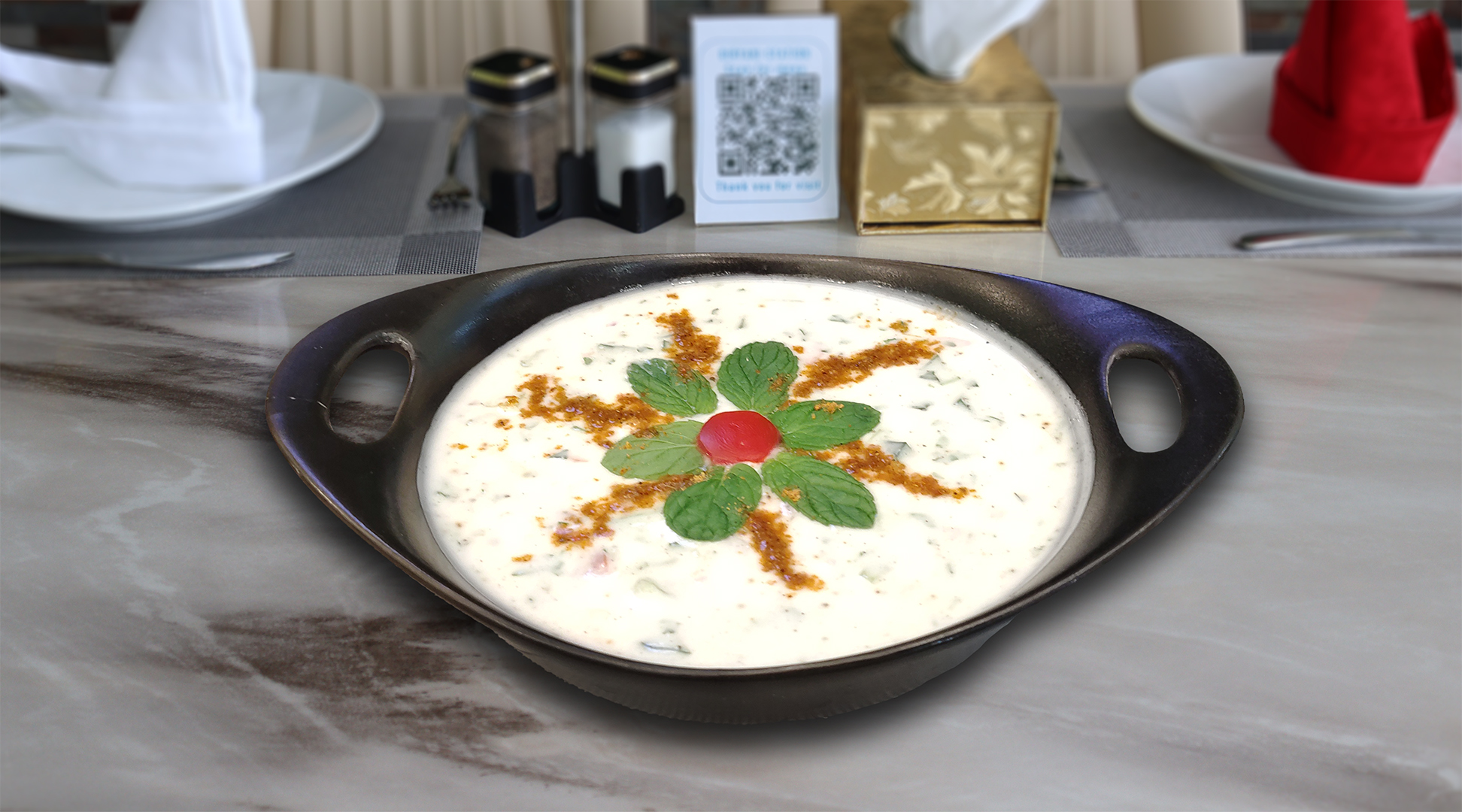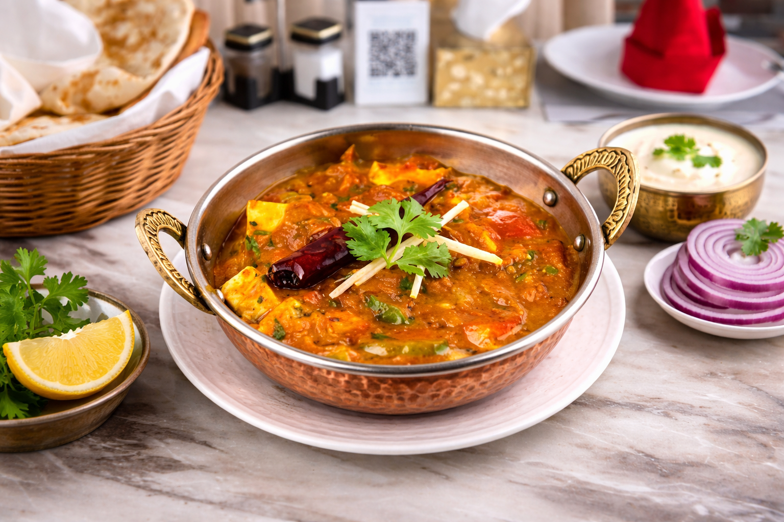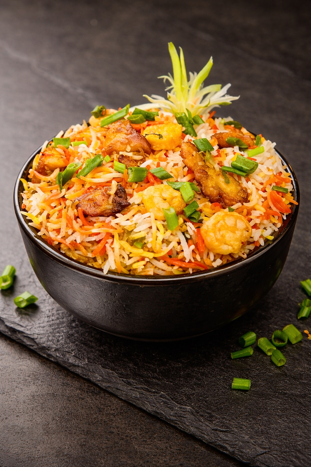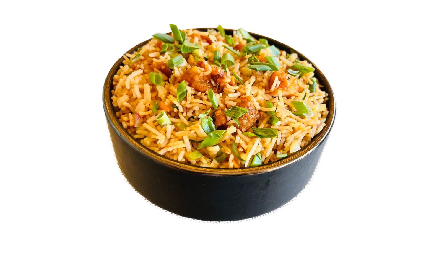 أرز بسمتي طويل الحبة مطهو ببطء على البخار مع دجاج طري متبل، وتوابل عطرية، ونكهة زعفران غنية، ويقدم مع سلطة خيار بالزبادي المنعشة ل