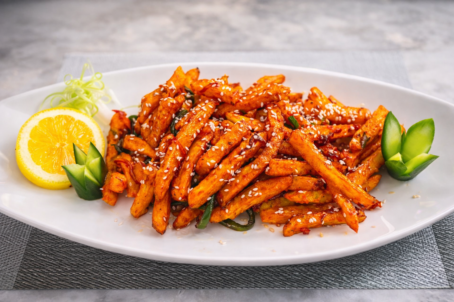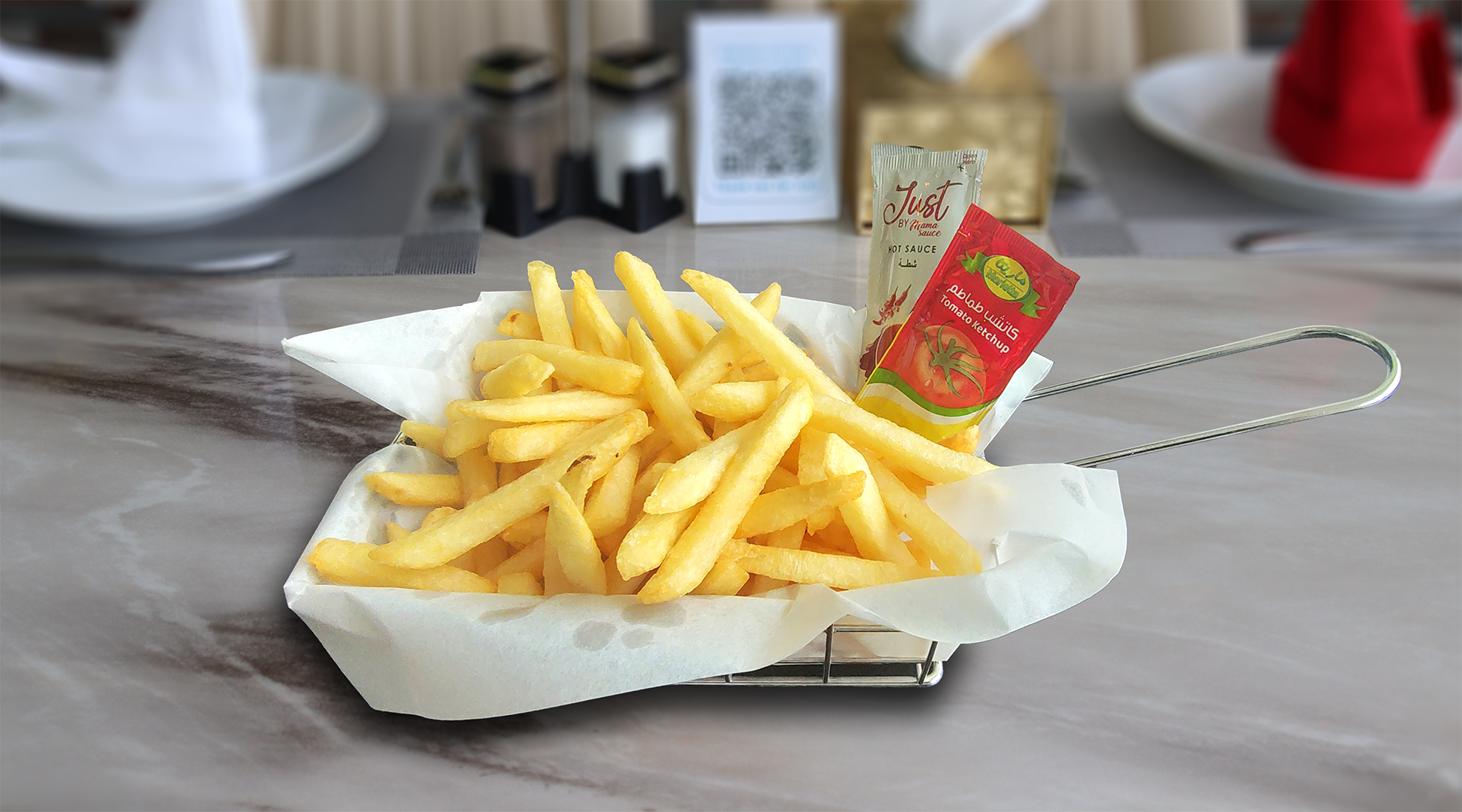 Potato fries make with chilli sauce and lemon بطاطس مقلية مع صلصة الفلفل الحار والليمون