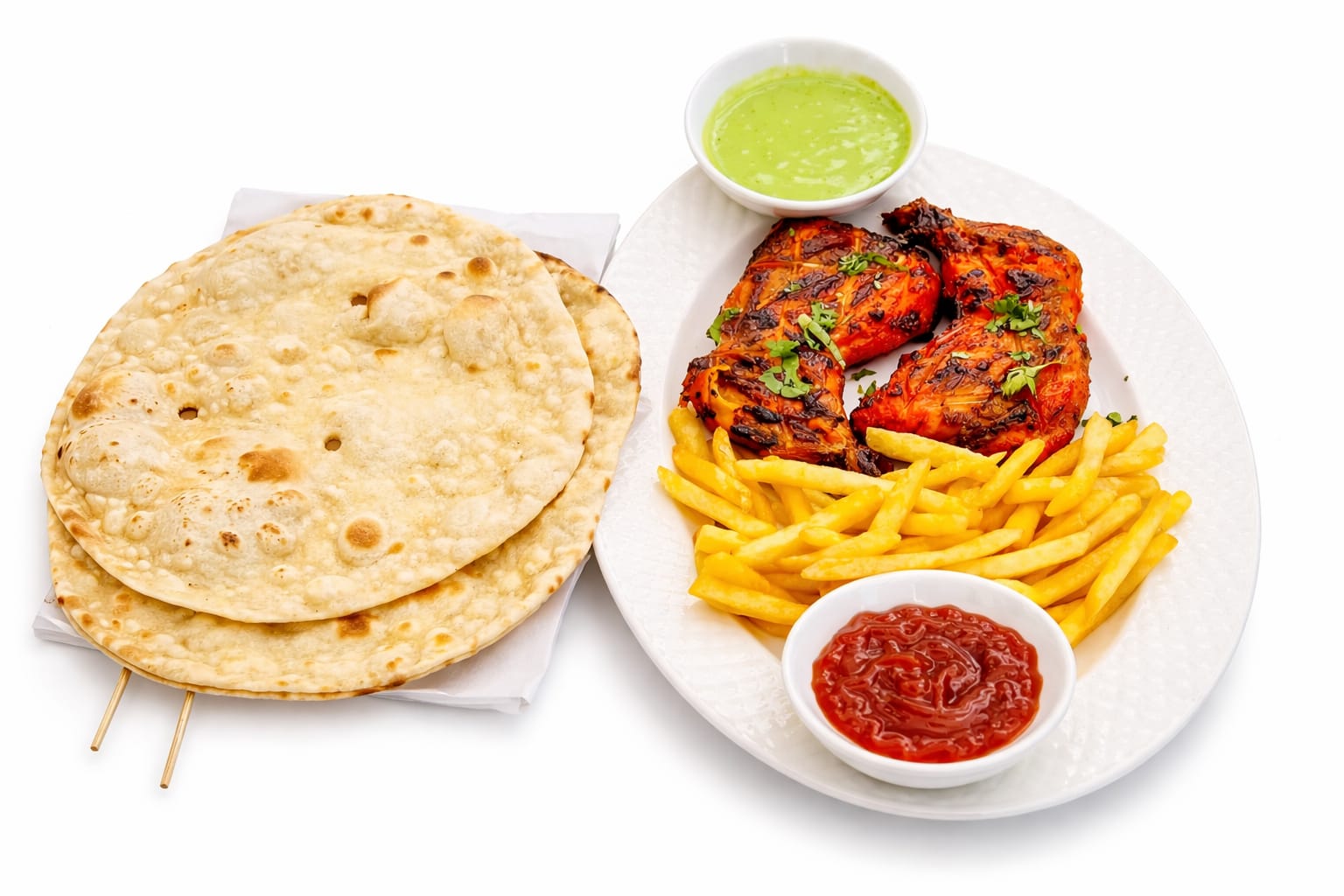 Two juicy, smoky flame-grilled chicken legs, cooked to perfection, served with golden French fries and 2 tandoori rotis.