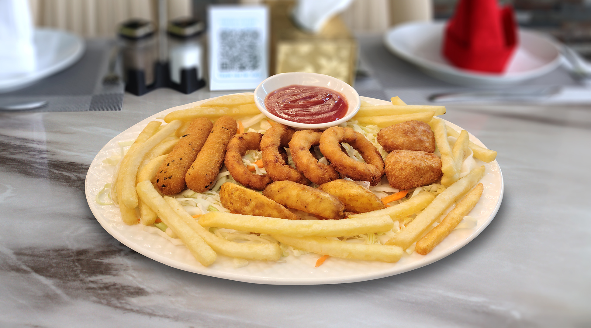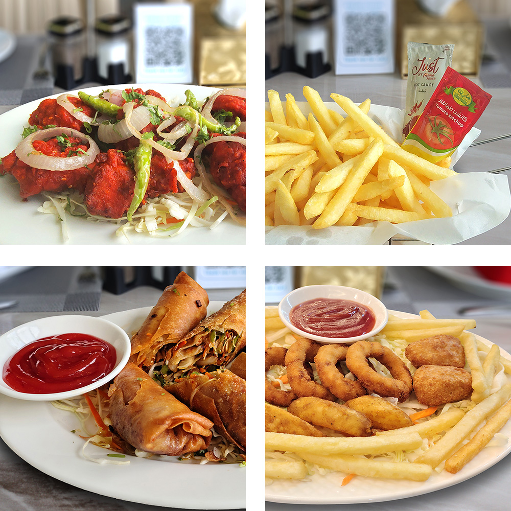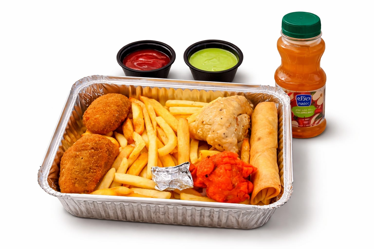 Chicken lollipop, spring roll, samosa, nuggets, french fries, ketchup, green sauce and apple juice. قطع دجاج لولي بوب، سبرينغ رول،