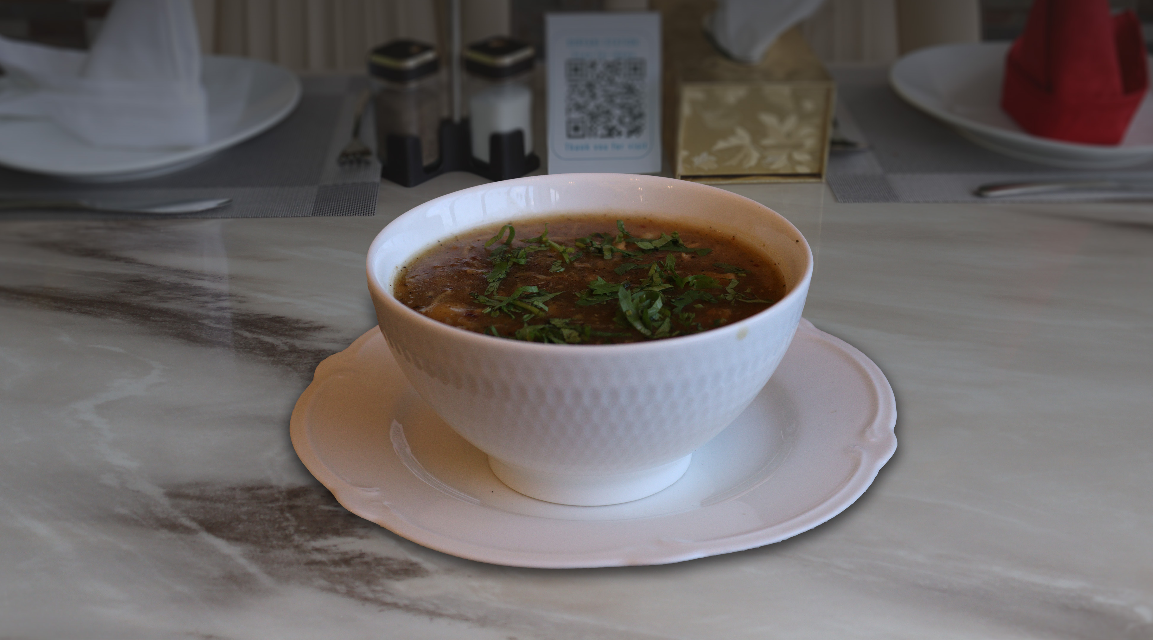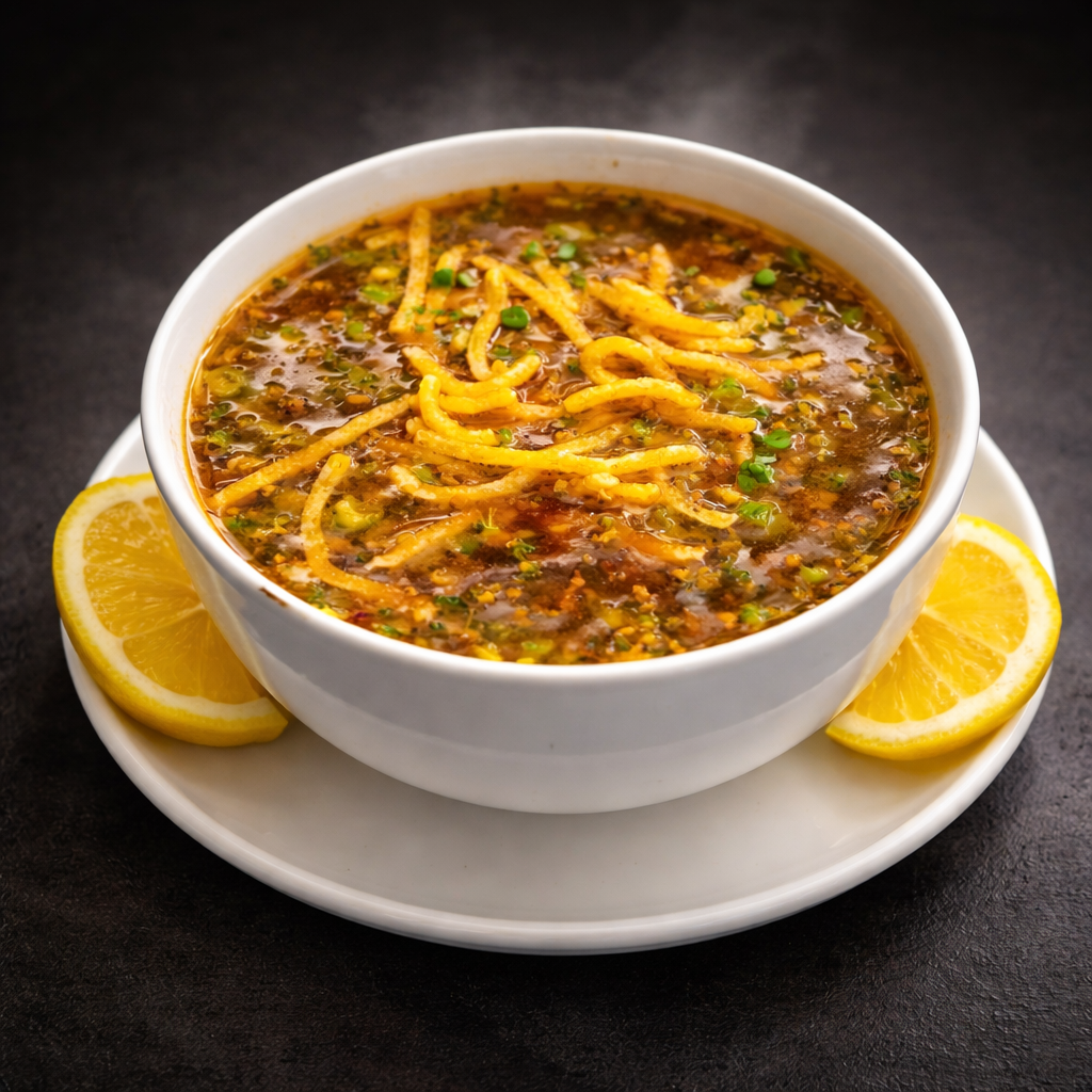 A hearty Indo-Chinese soup prepared with finely chopped vegetables, aromatic garlic and ginger, bold spices, and topped with crisp
