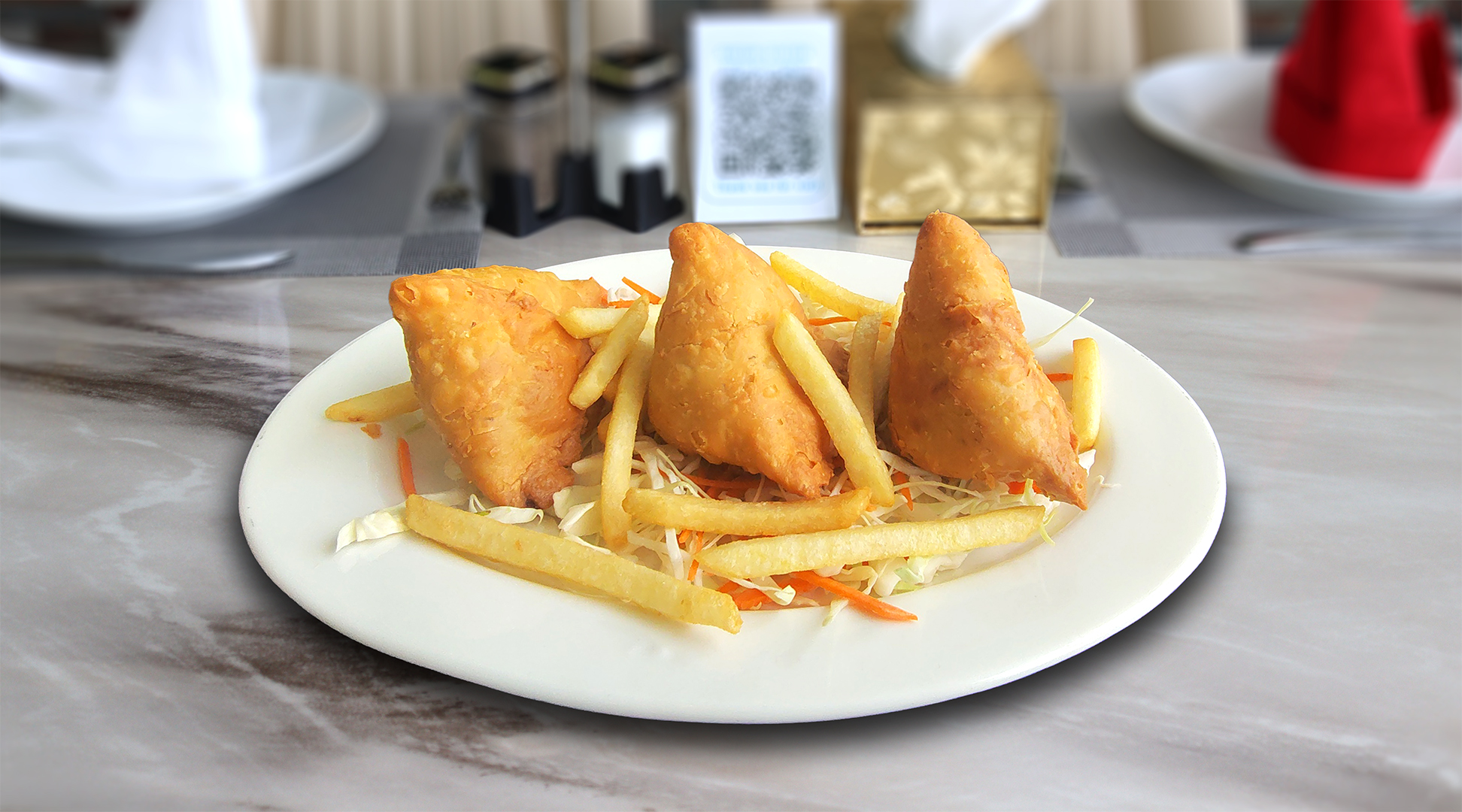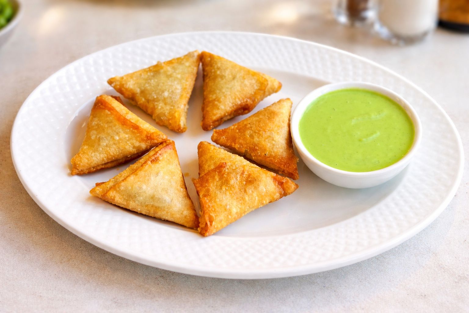 ست قطع من سمبوسة الدجاج، مقلية طازجة وتقدم مع صلصتنا الخضراء المصنوعة منزلياً.Six golden chicken samosas, fresh fried and served w
