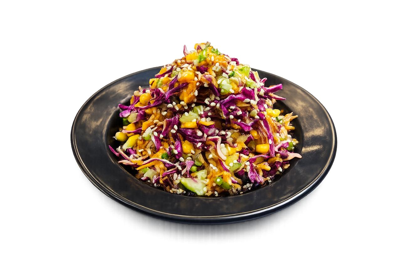 مزيج نابض بالحياة من الملفوف المقرمش والذرة الحلوة والخيار والخضراوات الطازجة ممزوجة بصلصة منزلية لذيذة ومزينة ببذور مغذية لمزيد م