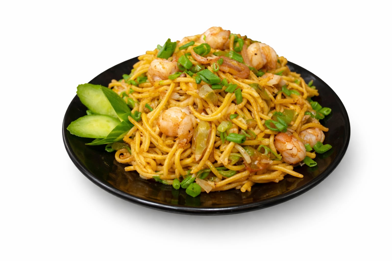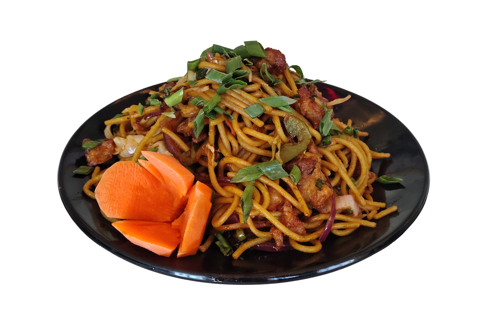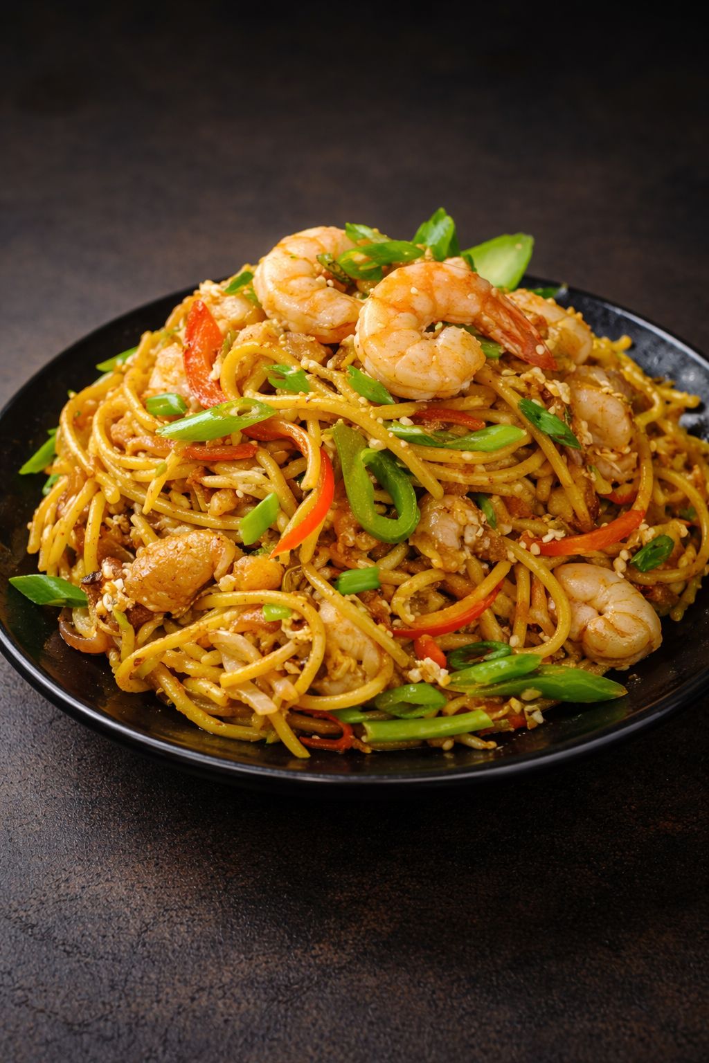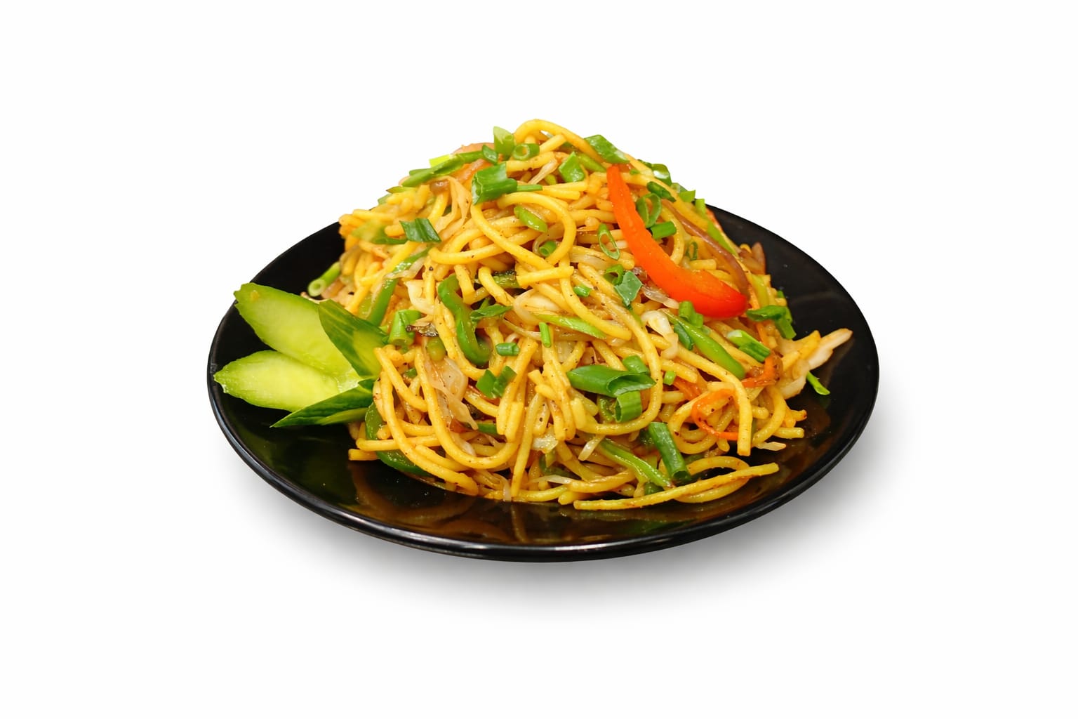 نودلز مقلية مع خضراوات طازجة مشكلة وصلصات لذيذة. Stir-fried noodles with fresh mixed vegetables and flavorful sauces.