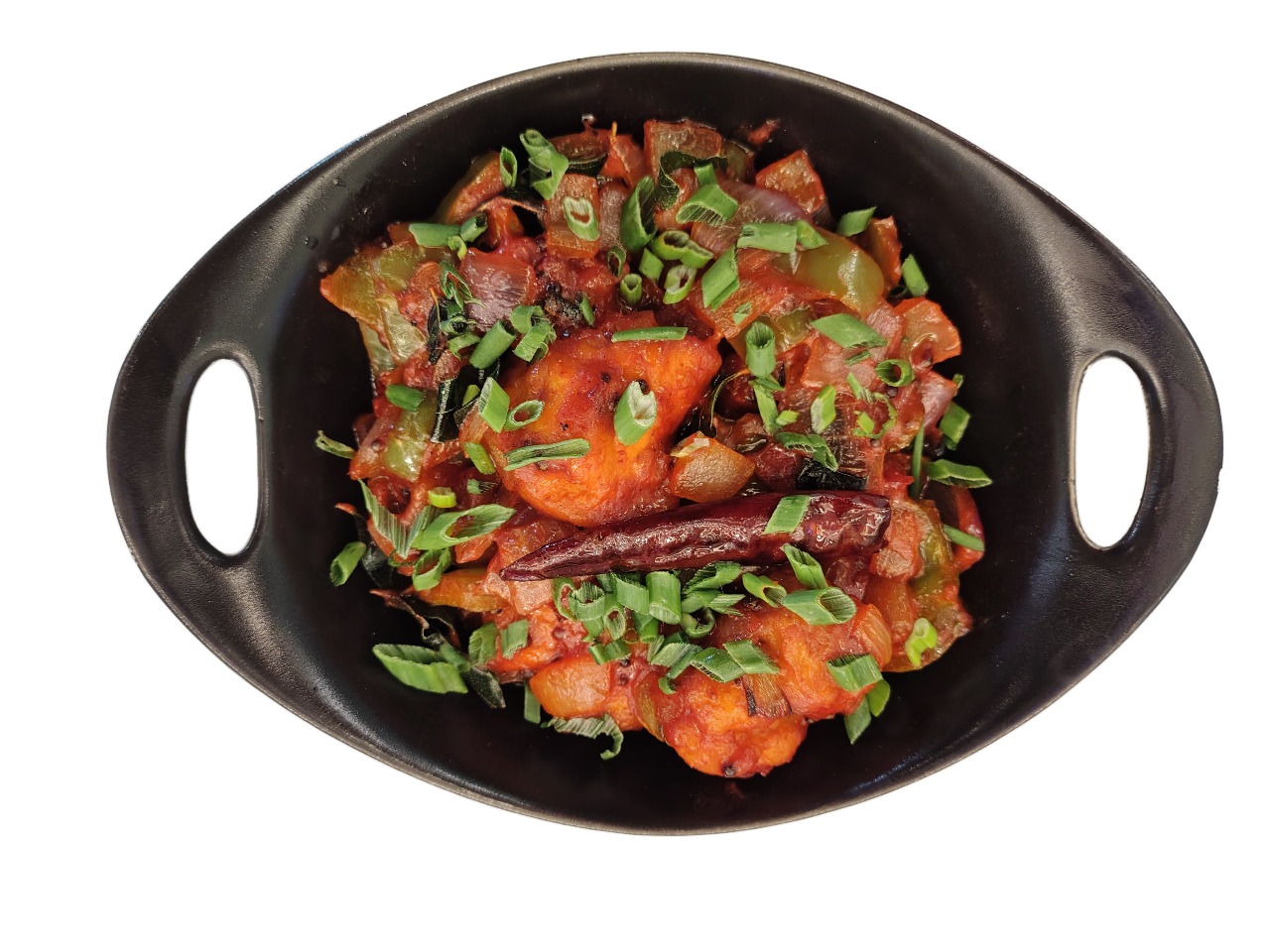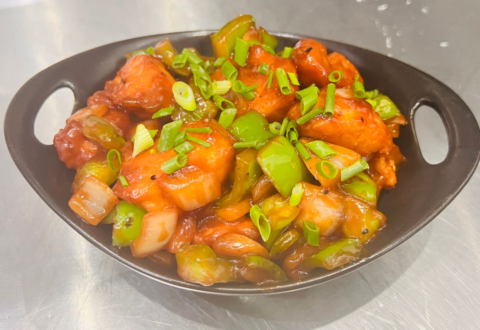 زلابية دجاج مصنوعة يدوياً، مقلية في مقلاة الووك مع صلصة الفلفل الحار الهندية الصينية المميزة، والتوابل العطرية، والخضراوات الطازجة